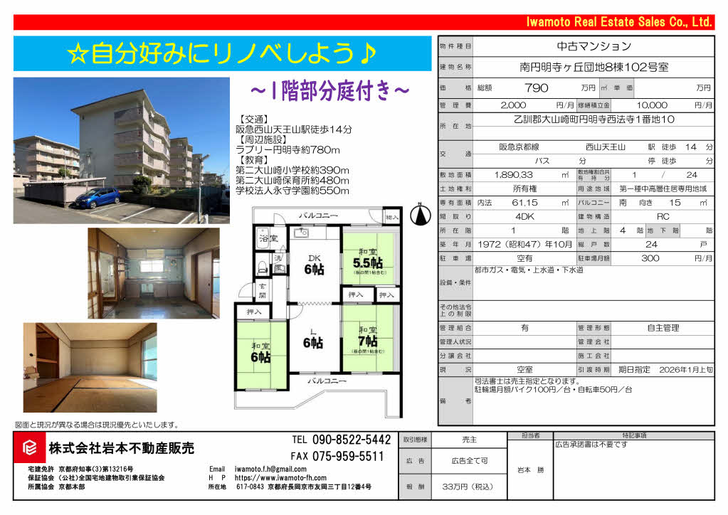 乙訓郡大山崎町字円明寺小字西法寺1番地10 南円明寺ヶ丘団地8棟102号室