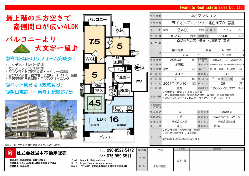 最上階!ライオンズマンション北白川701号室☆バルコニーより大文字一望♪【売主】